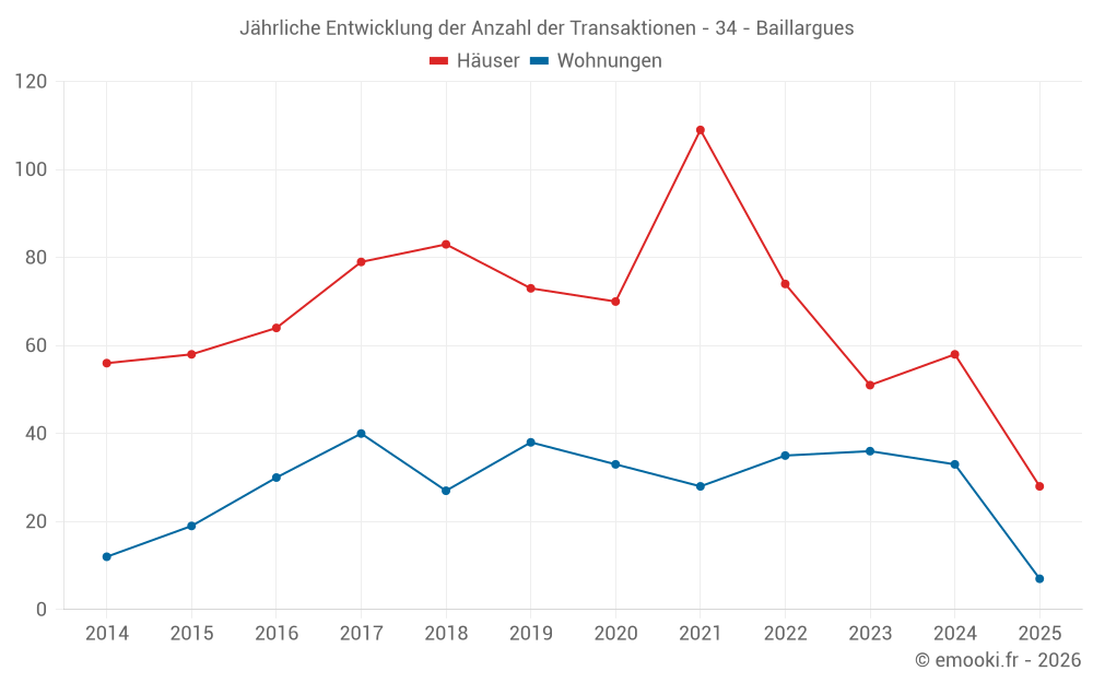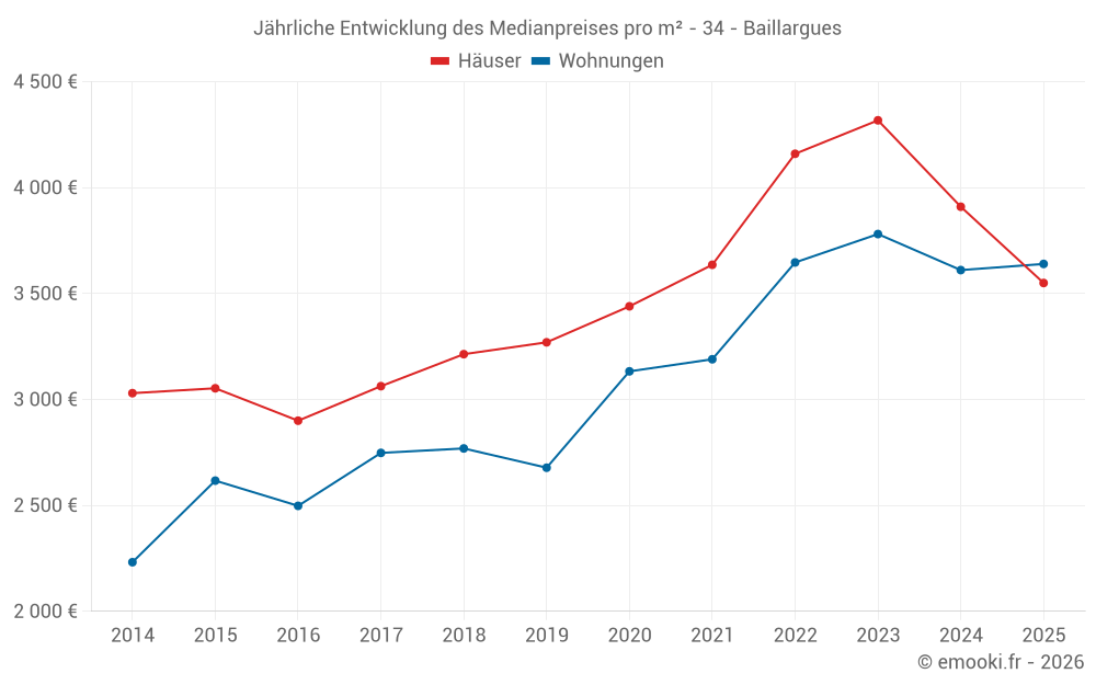 Der Durchschnittspreis auf den 28 Hausgeschäften der letzten 6 Monate in der Gemeinde Baillargues betrug 3 550 € pro Quadratmeter für einen mittleren Immobilienwert von 376 000 €. Über diesen Zeitraum hinweg lagen 60% der Transaktionen zwischen 2 509 und 4 823 € pro Quadratmeter (vom 2. bis zum 8. Dezil).