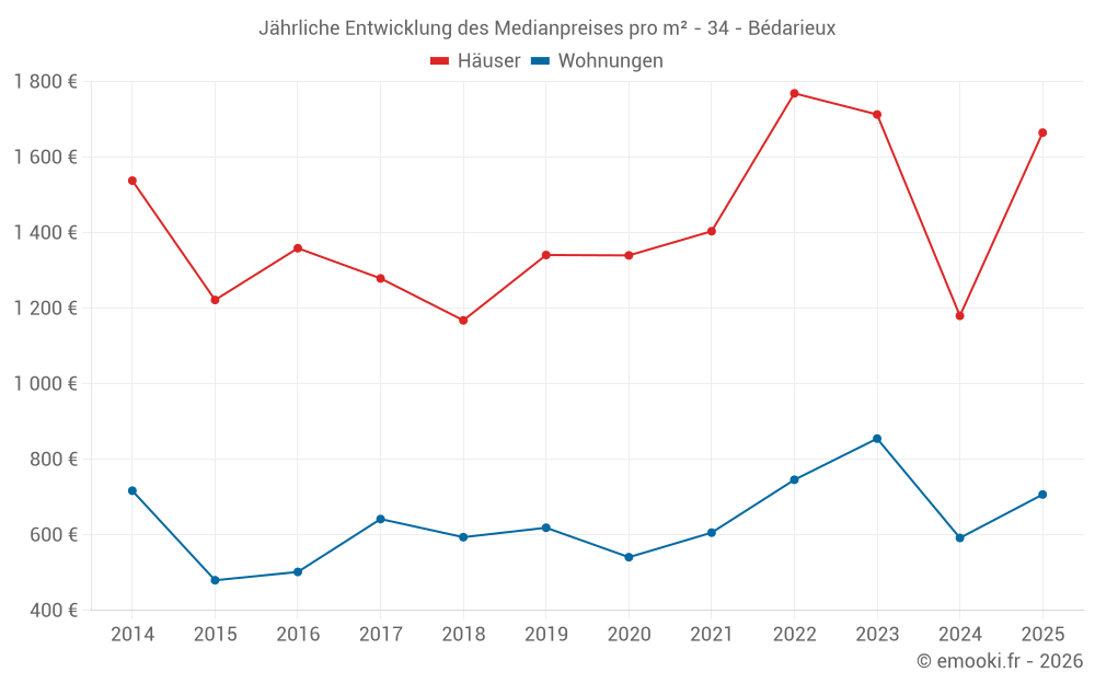 Der Durchschnittspreis auf den 19 Wohnungstransaktionen der letzten 6 Monate in der Gemeinde Bédarieux betrug 707 € pro Quadratmeter für einen mittleren Immobilienwert von 55 000 €. Über diesen Zeitraum hinweg lagen 60% der Transaktionen zwischen 477 und 1 140 € pro Quadratmeter (vom 2. bis zum 8. Dezil).