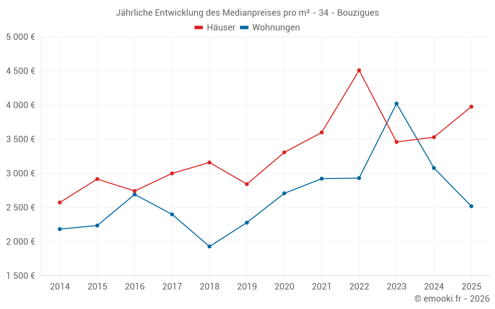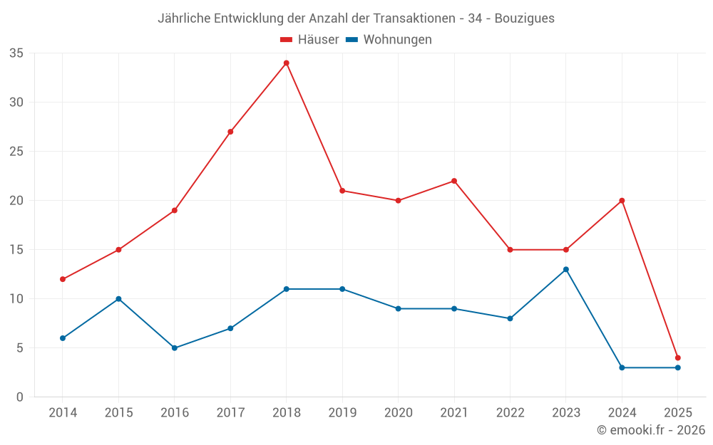 Der Durchschnittspreis auf den 16 Hausgeschäften der letzten 12 Monate in der Gemeinde Bouzigues betrug 3 530 € pro Quadratmeter für einen mittleren Immobilienwert von 363 215 €. Über diesen Zeitraum hinweg lagen 60% der Transaktionen zwischen 2 950 und 4 042 € pro Quadratmeter (vom 2. bis zum 8. Dezil).