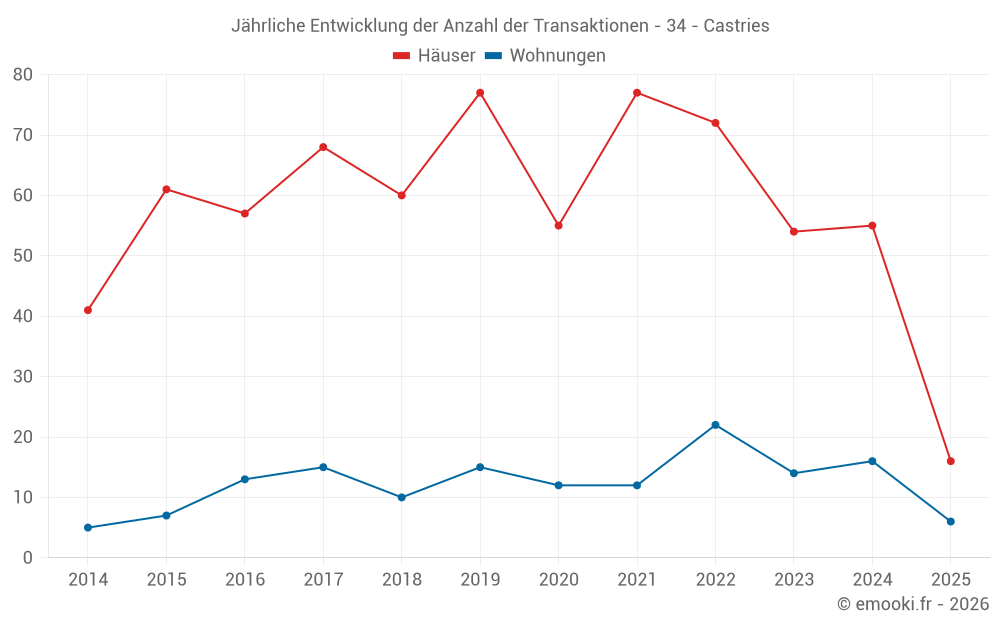 Der Durchschnittspreis auf den 16 Wohnungstransaktionen der letzten 12 Monate in der Gemeinde Castries betrug 3 569 € pro Quadratmeter für einen mittleren Immobilienwert von 191 475 €. Über diesen Zeitraum hinweg lagen 60% der Transaktionen zwischen 2 725 und 4 328 € pro Quadratmeter (vom 2. bis zum 8. Dezil).