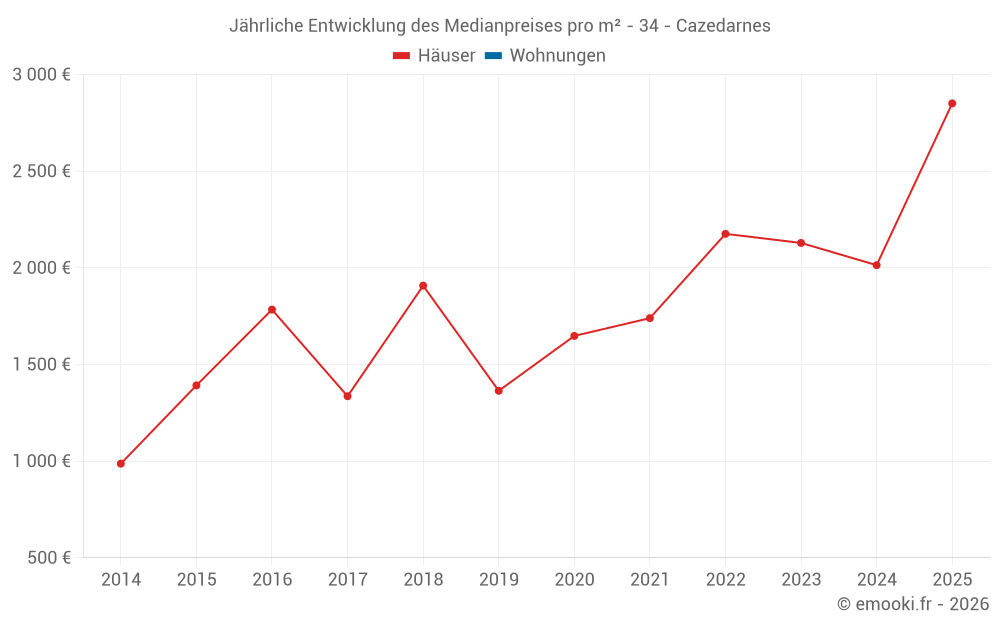 Der Durchschnittspreis auf den 15 Hausgeschäften der letzten 24 Monate in der Gemeinde Cazedarnes betrug 2 029 € pro Quadratmeter für einen mittleren Immobilienwert von 228 210 €. Über diesen Zeitraum hinweg lagen 60% der Transaktionen zwischen 1 222 und 2 855 € pro Quadratmeter (vom 2. bis zum 8. Dezil).