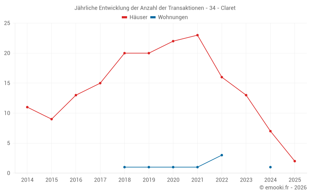 Der Durchschnittspreis auf den 20 Hausgeschäften der letzten 24 Monate in der Gemeinde Claret betrug 3 367 € pro Quadratmeter für einen mittleren Immobilienwert von 338 925 €. Über diesen Zeitraum hinweg lagen 60% der Transaktionen zwischen 2 484 und 3 630 € pro Quadratmeter (vom 2. bis zum 8. Dezil).