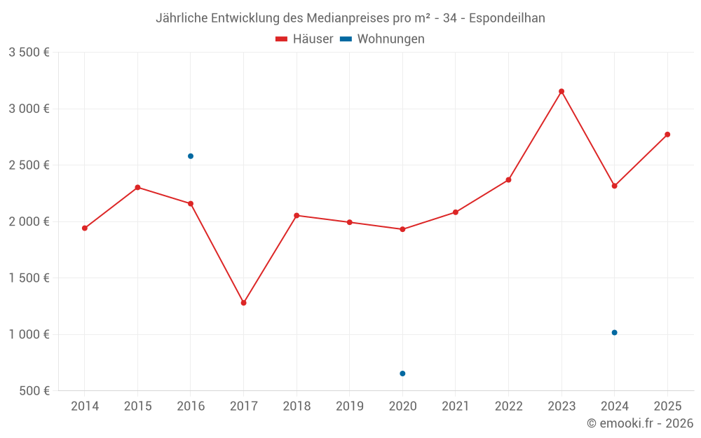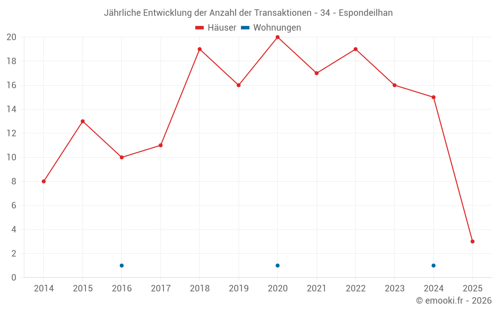 Der Durchschnittspreis auf den 27 Hausgeschäften der letzten 24 Monate in der Gemeinde Espondeilhan betrug 2 500 € pro Quadratmeter für einen mittleren Immobilienwert von 231 000 €. Über diesen Zeitraum hinweg lagen 60% der Transaktionen zwischen 1 482 und 3 274 € pro Quadratmeter (vom 2. bis zum 8. Dezil).