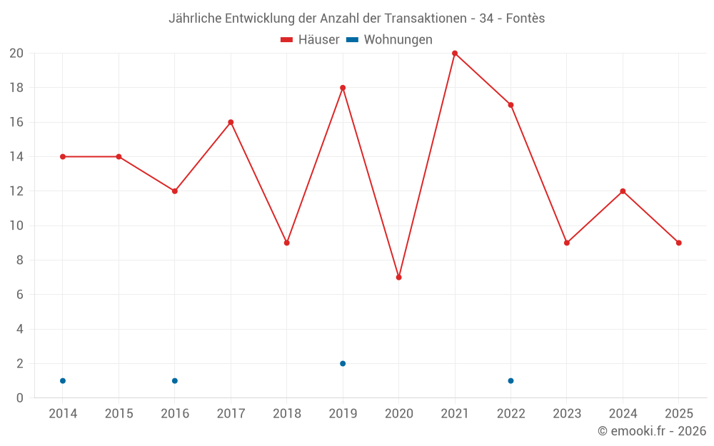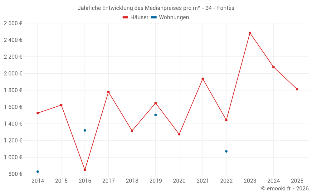 Der Durchschnittspreis auf den 25 Hausgeschäften der letzten 24 Monate in der Gemeinde Fontès betrug 2 117 € pro Quadratmeter für einen mittleren Immobilienwert von 170 000 €. Über diesen Zeitraum hinweg lagen 60% der Transaktionen zwischen 1 212 und 2 866 € pro Quadratmeter (vom 2. bis zum 8. Dezil).