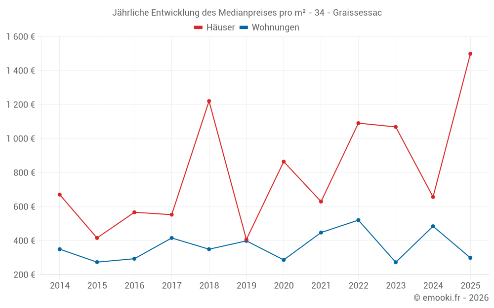 Der Durchschnittspreis auf den 26 Wohnungstransaktionen der letzten 24 Monate in der Gemeinde Graissessac betrug 338 € pro Quadratmeter für einen mittleren Immobilienwert von 29 000 €. Über diesen Zeitraum hinweg lagen 60% der Transaktionen zwischen 6 und 563 € pro Quadratmeter (vom 2. bis zum 8. Dezil).