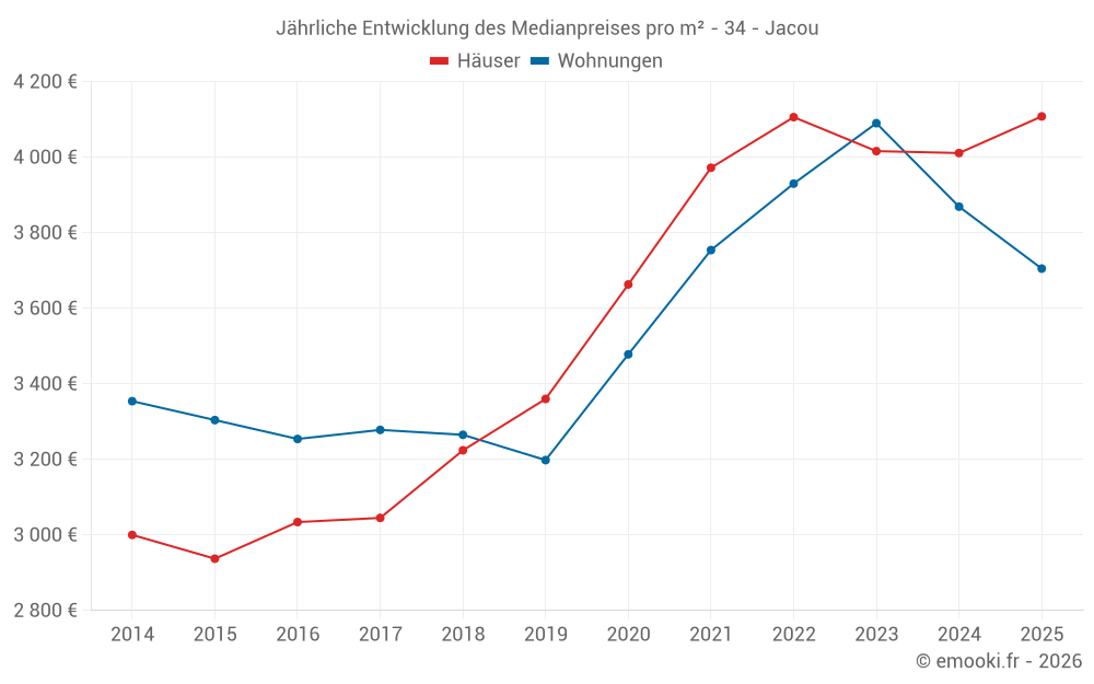 Der Durchschnittspreis auf den 21 Wohnungstransaktionen der letzten 12 Monate in der Gemeinde Jacou betrug 3 705 € pro Quadratmeter für einen mittleren Immobilienwert von 214 000 €. Über diesen Zeitraum hinweg lagen 60% der Transaktionen zwischen 3 292 und 4 366 € pro Quadratmeter (vom 2. bis zum 8. Dezil).