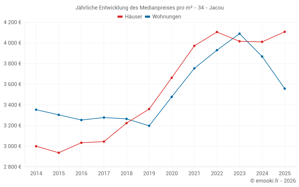 Der Durchschnittspreis auf den 30 Hausgeschäften der letzten 12 Monate in der Gemeinde Jacou betrug 4 017 € pro Quadratmeter für einen mittleren Immobilienwert von 365 500 €. Über diesen Zeitraum hinweg lagen 60% der Transaktionen zwischen 3 406 und 4 525 € pro Quadratmeter (vom 2. bis zum 8. Dezil).