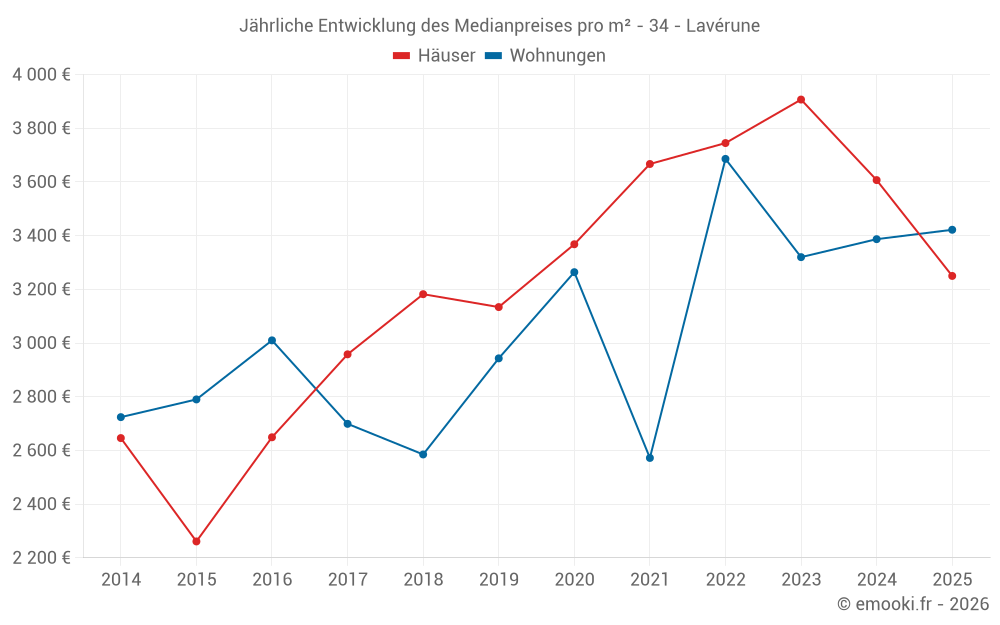 Der Durchschnittspreis auf den 26 Hausgeschäften der letzten 12 Monate in der Gemeinde Lavérune betrug 3 504 € pro Quadratmeter für einen mittleren Immobilienwert von 313 000 €. Über diesen Zeitraum hinweg lagen 60% der Transaktionen zwischen 2 703 und 4 213 € pro Quadratmeter (vom 2. bis zum 8. Dezil).