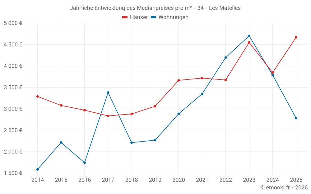 Der Durchschnittspreis auf den 22 Hausgeschäften der letzten 24 Monate in der Gemeinde Les Matelles betrug 4 418 € pro Quadratmeter für einen mittleren Immobilienwert von 473 938 €. Über diesen Zeitraum hinweg lagen 60% der Transaktionen zwischen 3 013 und 4 901 € pro Quadratmeter (vom 2. bis zum 8. Dezil).
