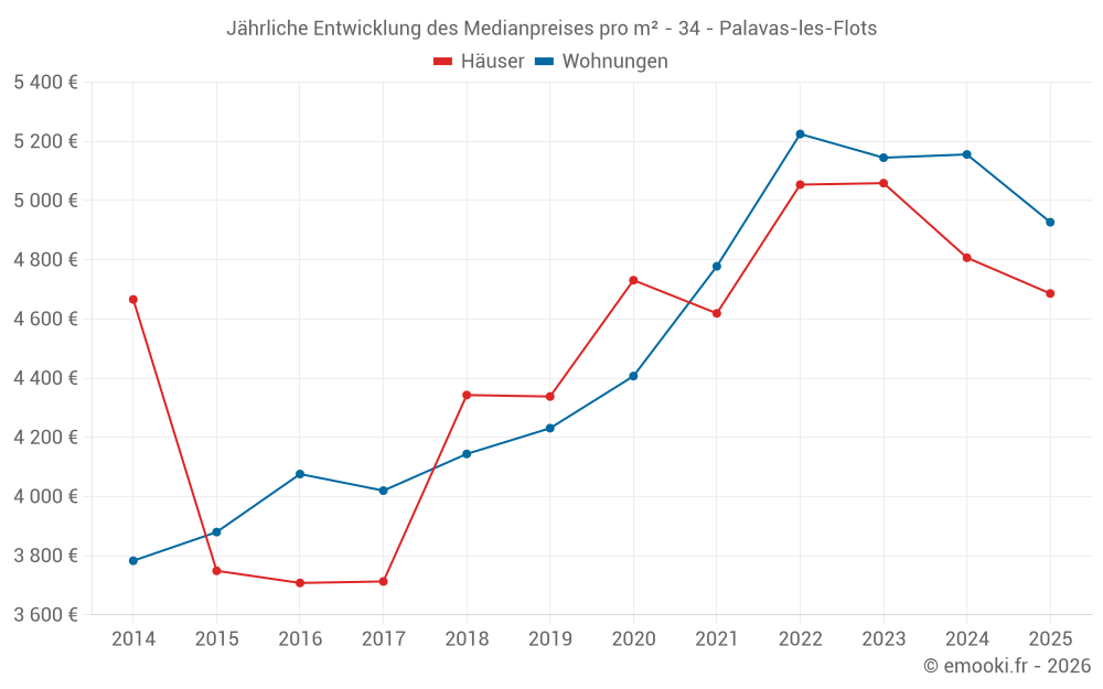 Der Durchschnittspreis auf den 39 Hausgeschäften der letzten 12 Monate in der Gemeinde Palavas-les-Flots betrug 4 686 € pro Quadratmeter für einen mittleren Immobilienwert von 393 000 €. Über diesen Zeitraum hinweg lagen 60% der Transaktionen zwischen 3 841 und 6 192 € pro Quadratmeter (vom 2. bis zum 8. Dezil).