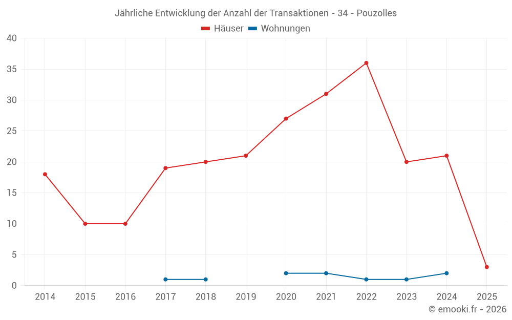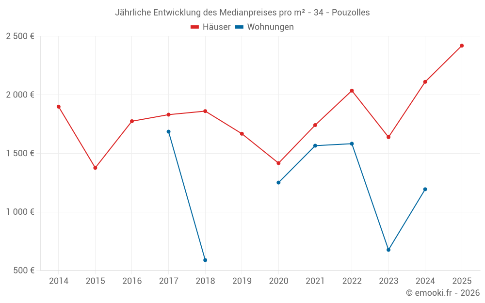 Der Durchschnittspreis auf den 33 Hausgeschäften der letzten 24 Monate in der Gemeinde Pouzolles betrug 2 077 € pro Quadratmeter für einen mittleren Immobilienwert von 152 000 €. Über diesen Zeitraum hinweg lagen 60% der Transaktionen zwischen 1 391 und 2 749 € pro Quadratmeter (vom 2. bis zum 8. Dezil).