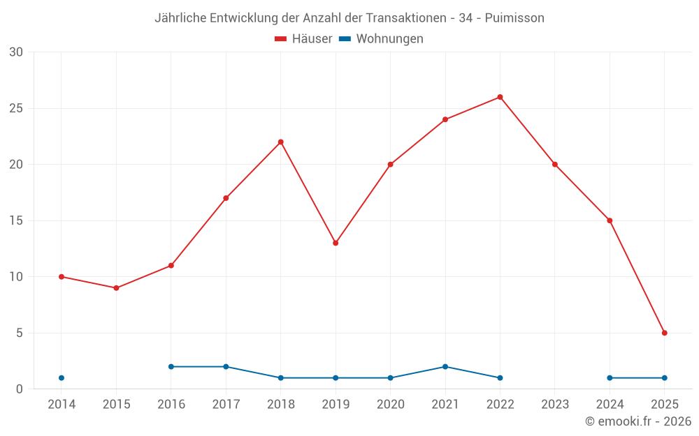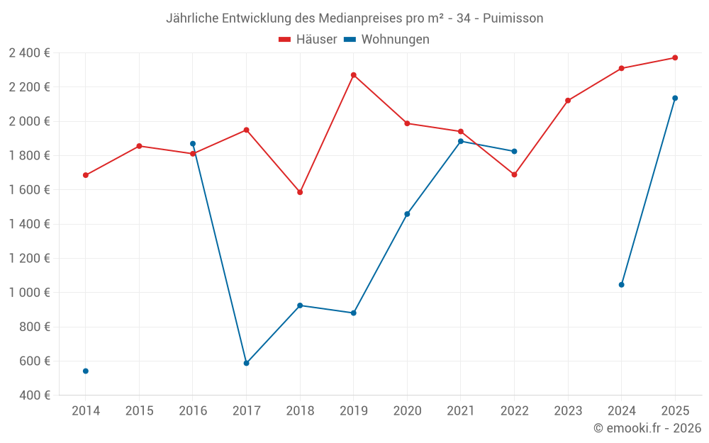 Der Durchschnittspreis auf den 31 Hausgeschäften der letzten 24 Monate in der Gemeinde Puimisson betrug 2 310 € pro Quadratmeter für einen mittleren Immobilienwert von 205 900 €. Über diesen Zeitraum hinweg lagen 60% der Transaktionen zwischen 1 243 und 3 085 € pro Quadratmeter (vom 2. bis zum 8. Dezil).