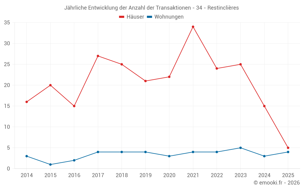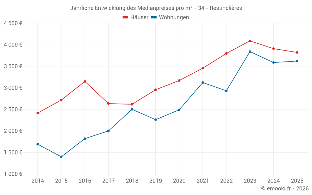 Der Durchschnittspreis auf den 30 Hausgeschäften der letzten 24 Monate in der Gemeinde Restinclières betrug 3 988 € pro Quadratmeter für einen mittleren Immobilienwert von 407 000 €. Über diesen Zeitraum hinweg lagen 60% der Transaktionen zwischen 3 408 und 4 372 € pro Quadratmeter (vom 2. bis zum 8. Dezil).