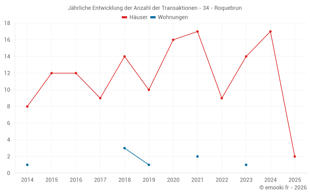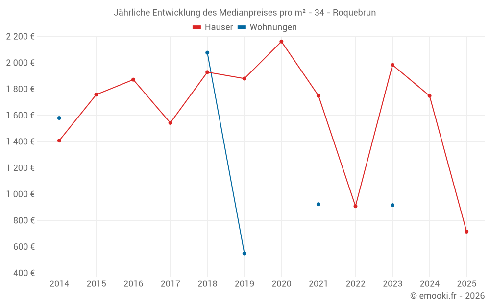 Der Durchschnittspreis auf den 25 Hausgeschäften der letzten 24 Monate in der Gemeinde Roquebrun betrug 1 742 € pro Quadratmeter für einen mittleren Immobilienwert von 127 000 €. Über diesen Zeitraum hinweg lagen 60% der Transaktionen zwischen 1 147 und 2 987 € pro Quadratmeter (vom 2. bis zum 8. Dezil).