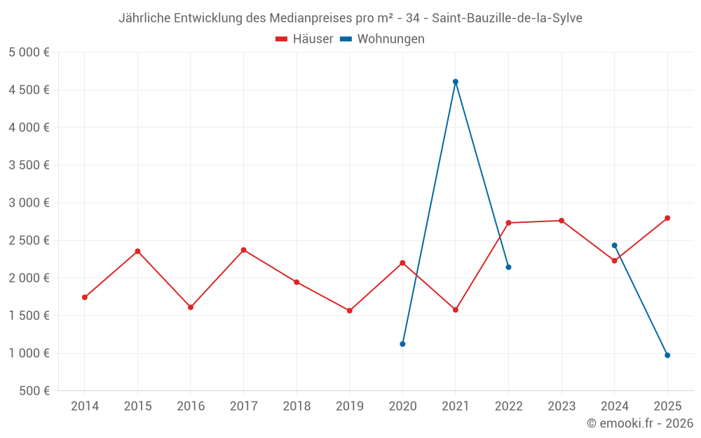 Der Durchschnittspreis auf den 15 Hausgeschäften der letzten 24 Monate in der Gemeinde Saint-Bauzille-de-la-Sylve betrug 2 666 € pro Quadratmeter für einen mittleren Immobilienwert von 226 600 €. Über diesen Zeitraum hinweg lagen 60% der Transaktionen zwischen 2 176 und 2 889 € pro Quadratmeter (vom 2. bis zum 8. Dezil).