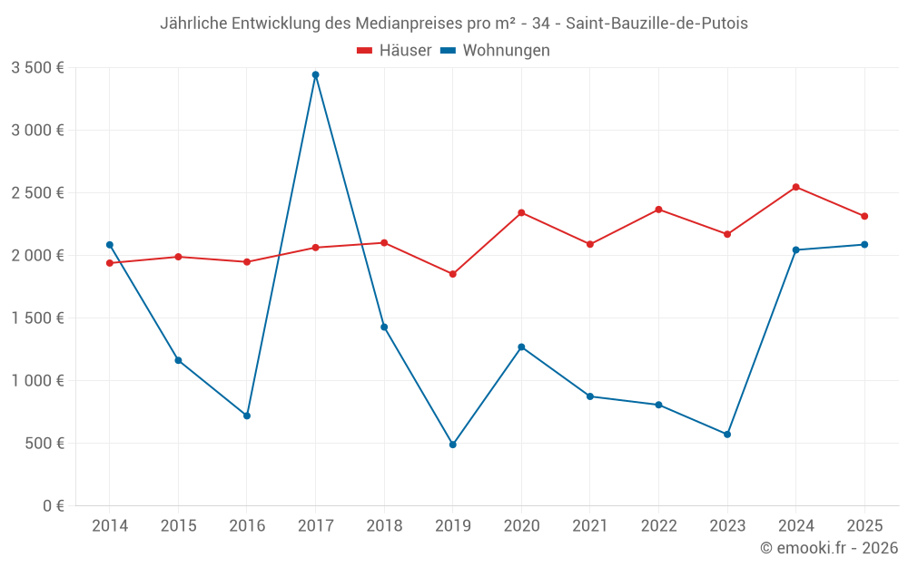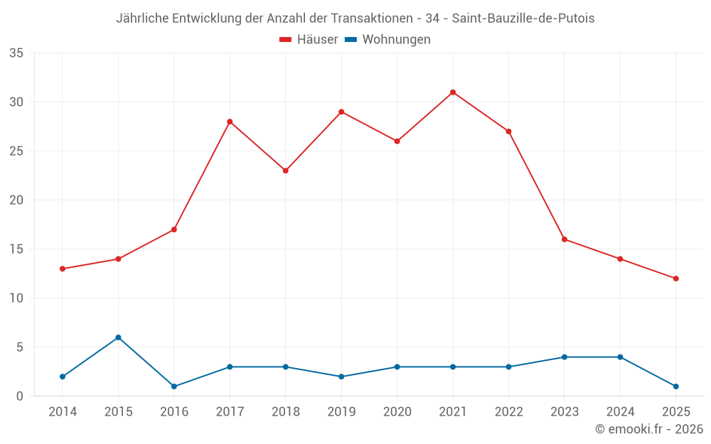 Der Durchschnittspreis auf den 23 Hausgeschäften der letzten 12 Monate in der Gemeinde Saint-Bauzille-de-Putois betrug 2 459 € pro Quadratmeter für einen mittleren Immobilienwert von 223 500 €. Über diesen Zeitraum hinweg lagen 60% der Transaktionen zwischen 1 365 und 2 896 € pro Quadratmeter (vom 2. bis zum 8. Dezil).