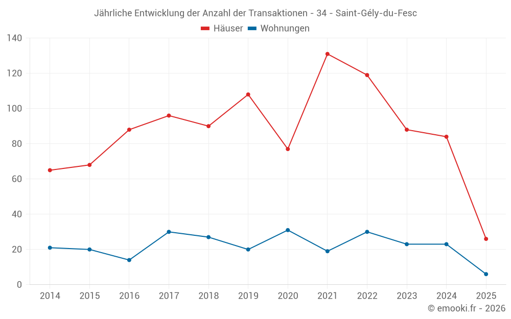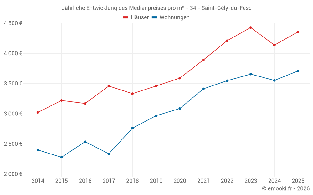 Der Durchschnittspreis auf den 26 Hausgeschäften der letzten 6 Monate in der Gemeinde Saint-Gély-du-Fesc betrug 4 358 € pro Quadratmeter für einen mittleren Immobilienwert von 478 000 €. Über diesen Zeitraum hinweg lagen 60% der Transaktionen zwischen 3 876 und 4 998 € pro Quadratmeter (vom 2. bis zum 8. Dezil).