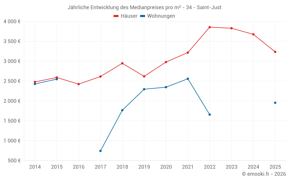 Der Durchschnittspreis auf den 19 Hausgeschäften der letzten 12 Monate in der Gemeinde Saint-Just betrug 3 500 € pro Quadratmeter für einen mittleren Immobilienwert von 297 550 €. Über diesen Zeitraum hinweg lagen 60% der Transaktionen zwischen 2 841 und 4 148 € pro Quadratmeter (vom 2. bis zum 8. Dezil).