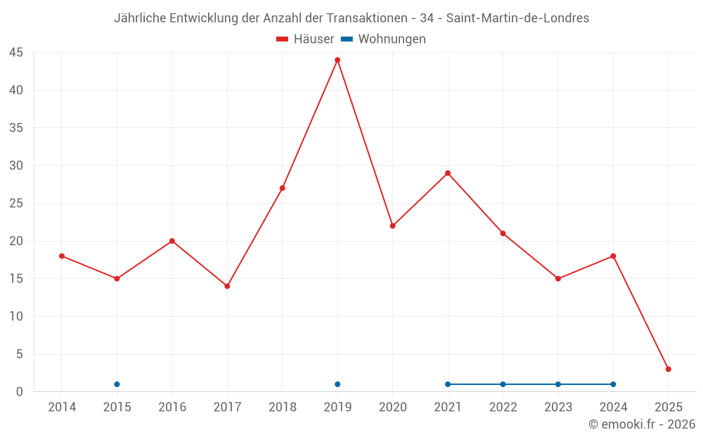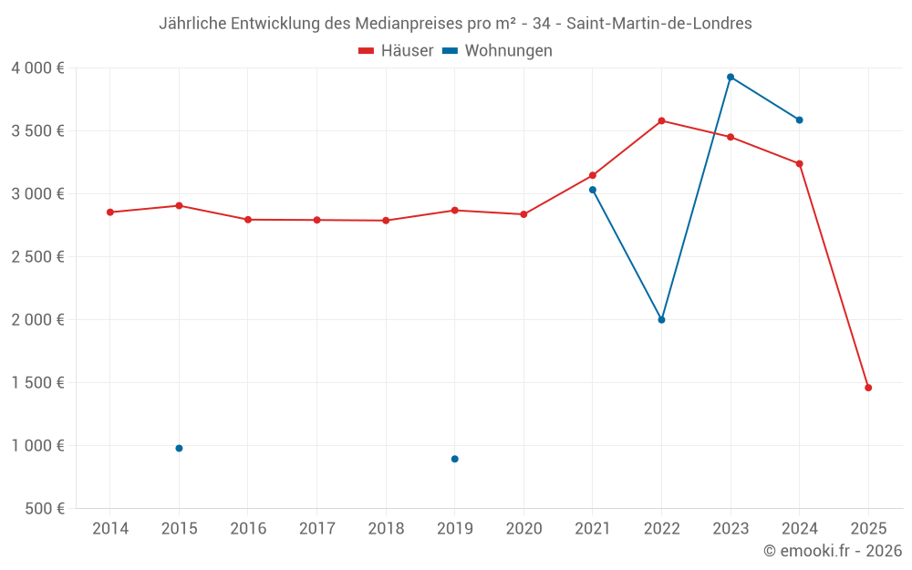 Der Durchschnittspreis auf den 30 Hausgeschäften der letzten 24 Monate in der Gemeinde Saint-Martin-de-Londres betrug 3 240 € pro Quadratmeter für einen mittleren Immobilienwert von 335 600 €. Über diesen Zeitraum hinweg lagen 60% der Transaktionen zwischen 2 112 und 3 917 € pro Quadratmeter (vom 2. bis zum 8. Dezil).