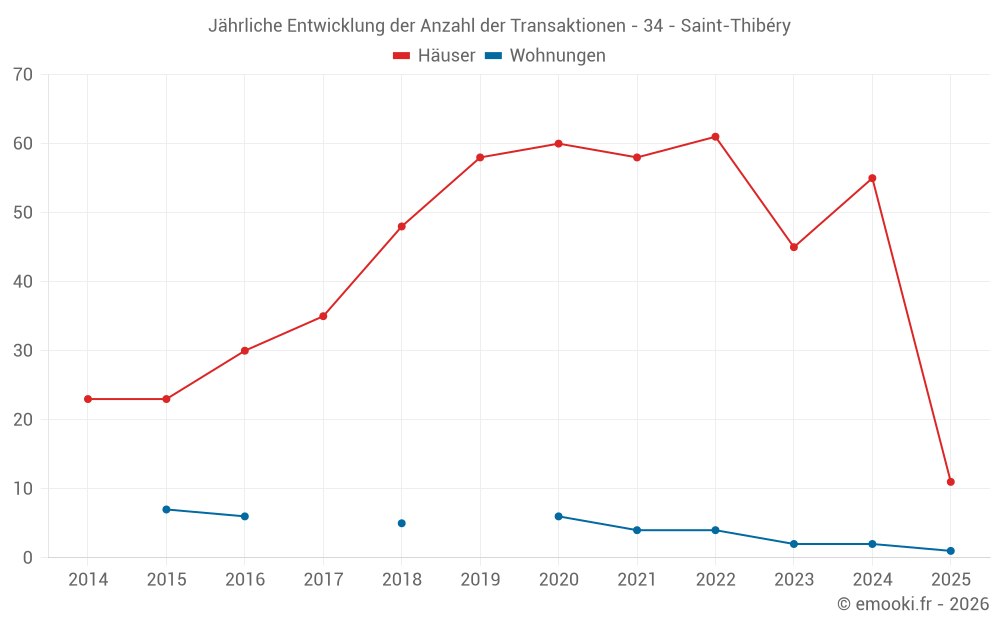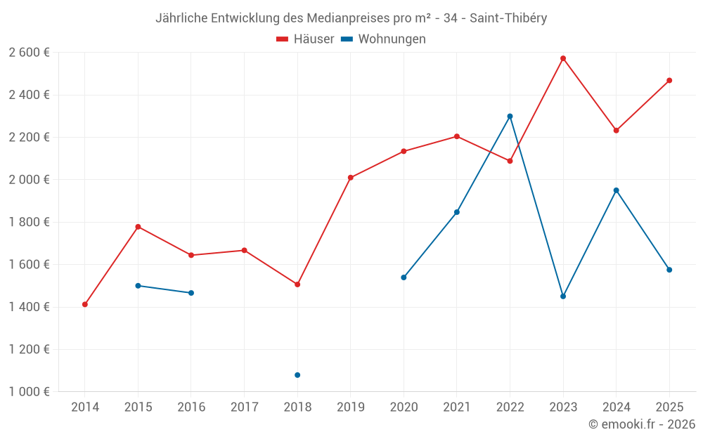 Der Durchschnittspreis auf den 40 Hausgeschäften der letzten 12 Monate in der Gemeinde Saint-Thibéry betrug 2 522 € pro Quadratmeter für einen mittleren Immobilienwert von 227 850 €. Über diesen Zeitraum hinweg lagen 60% der Transaktionen zwischen 1 822 und 3 020 € pro Quadratmeter (vom 2. bis zum 8. Dezil).