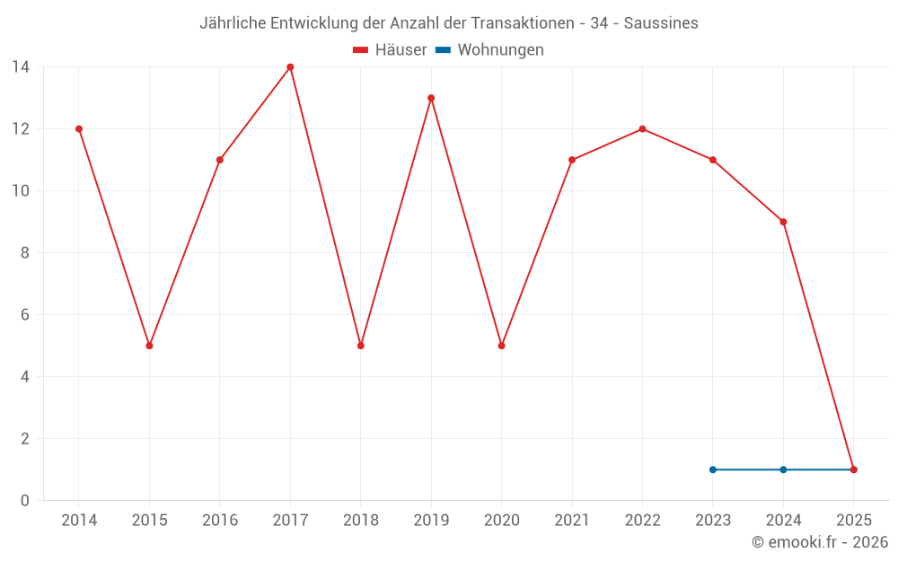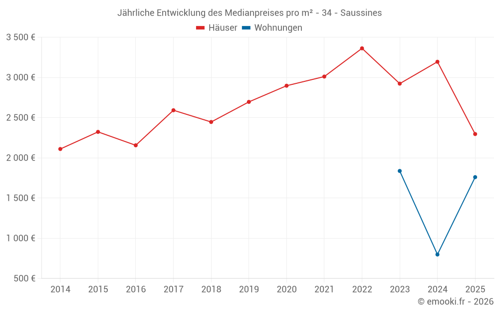 Der Durchschnittspreis auf den 16 Hausgeschäften der letzten 24 Monate in der Gemeinde Saussines betrug 2 840 € pro Quadratmeter für einen mittleren Immobilienwert von 290 975 €. Über diesen Zeitraum hinweg lagen 60% der Transaktionen zwischen 56 und 3 782 € pro Quadratmeter (vom 2. bis zum 8. Dezil).