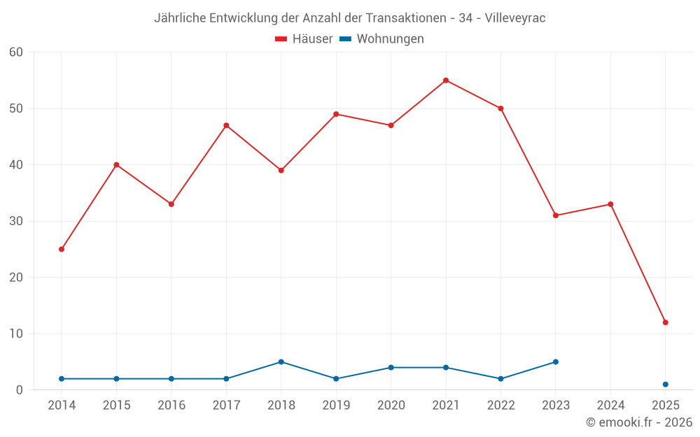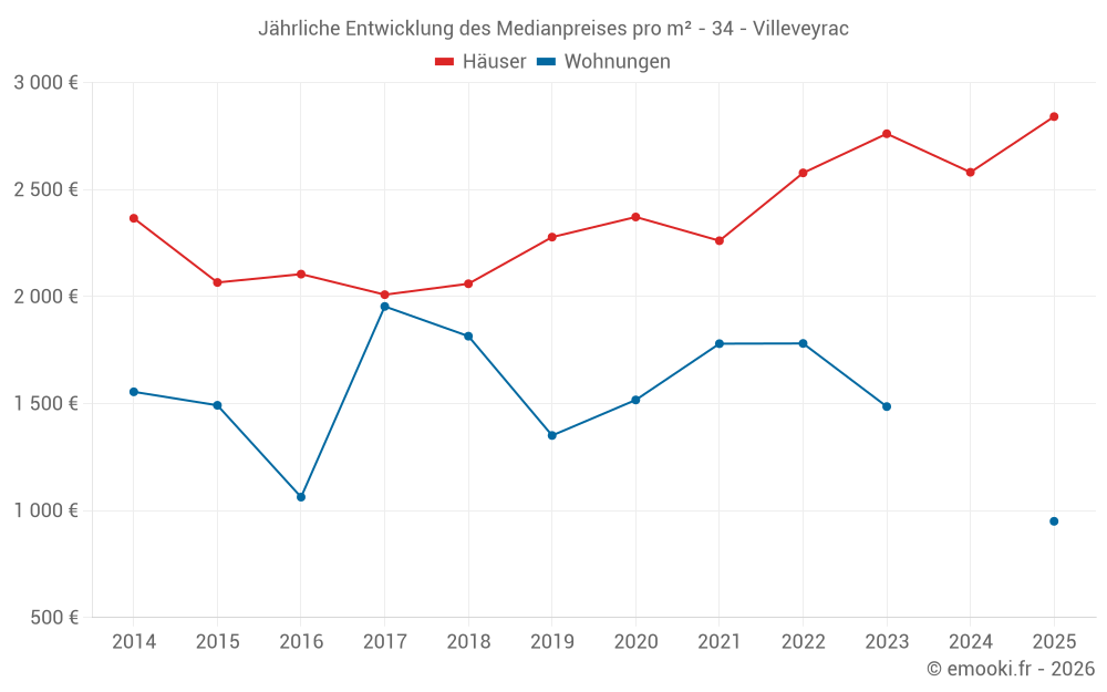 Der Durchschnittspreis auf den 34 Hausgeschäften der letzten 12 Monate in der Gemeinde Villeveyrac betrug 2 546 € pro Quadratmeter für einen mittleren Immobilienwert von 235 890 €. Über diesen Zeitraum hinweg lagen 60% der Transaktionen zwischen 1 610 und 3 417 € pro Quadratmeter (vom 2. bis zum 8. Dezil).