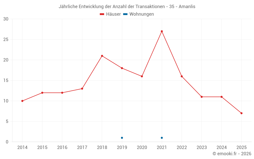 Der Durchschnittspreis auf den 24 Hausgeschäften der letzten 24 Monate in der Gemeinde Amanlis betrug 2 180 € pro Quadratmeter für einen mittleren Immobilienwert von 219 518 €. Über diesen Zeitraum hinweg lagen 60% der Transaktionen zwischen 1 685 und 2 760 € pro Quadratmeter (vom 2. bis zum 8. Dezil).