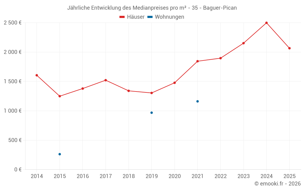 Der Durchschnittspreis auf den 27 Hausgeschäften der letzten 24 Monate in der Gemeinde Baguer-Pican betrug 2 373 € pro Quadratmeter für einen mittleren Immobilienwert von 248 000 €. Über diesen Zeitraum hinweg lagen 60% der Transaktionen zwischen 2 050 und 2 650 € pro Quadratmeter (vom 2. bis zum 8. Dezil).