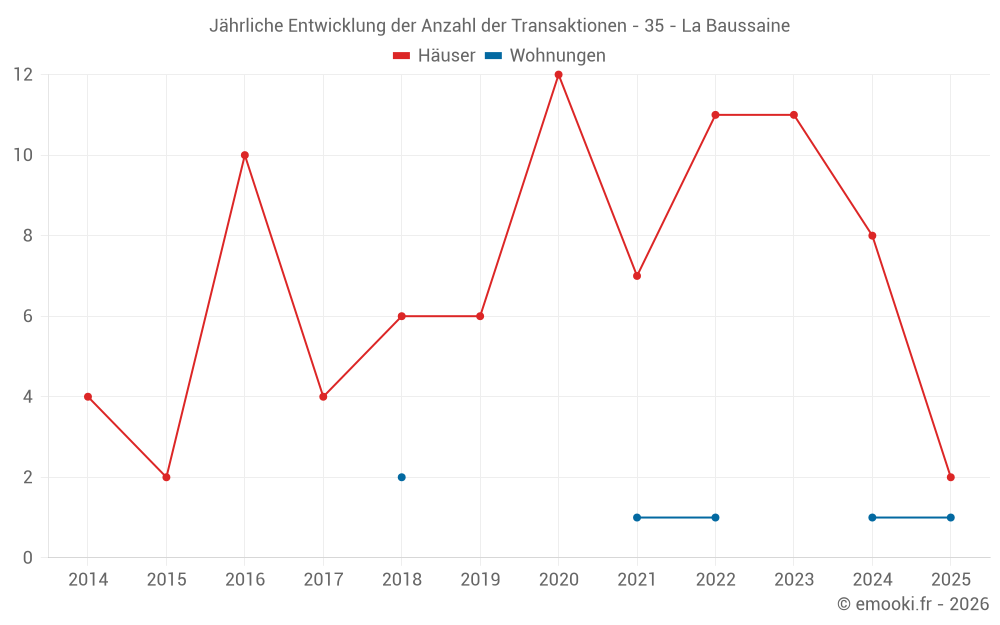 Der Durchschnittspreis auf den 18 Hausgeschäften der letzten 24 Monate in der Gemeinde La Baussaine betrug 2 164 € pro Quadratmeter für einen mittleren Immobilienwert von 216 000 €. Über diesen Zeitraum hinweg lagen 60% der Transaktionen zwischen 1 702 und 2 538 € pro Quadratmeter (vom 2. bis zum 8. Dezil).