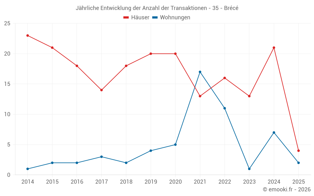 Der Durchschnittspreis auf den 21 Hausgeschäften der letzten 12 Monate in der Gemeinde Brécé betrug 2 812 € pro Quadratmeter für einen mittleren Immobilienwert von 272 800 €. Über diesen Zeitraum hinweg lagen 60% der Transaktionen zwischen 2 386 und 3 289 € pro Quadratmeter (vom 2. bis zum 8. Dezil).
