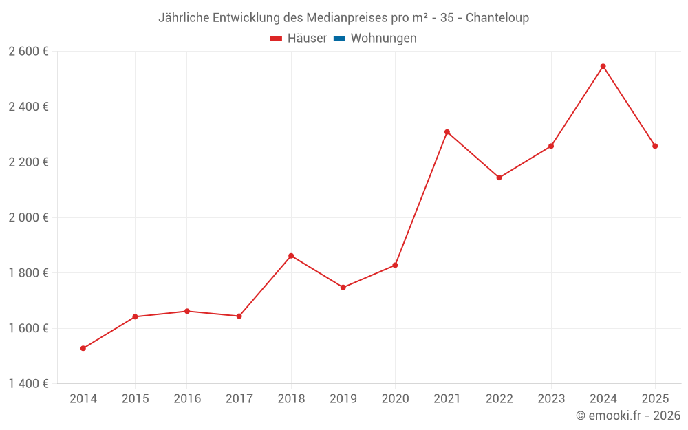 Der Durchschnittspreis auf den 24 Hausgeschäften der letzten 24 Monate in der Gemeinde Chanteloup betrug 2 410 € pro Quadratmeter für einen mittleren Immobilienwert von 214 618 €. Über diesen Zeitraum hinweg lagen 60% der Transaktionen zwischen 2 141 und 2 768 € pro Quadratmeter (vom 2. bis zum 8. Dezil).