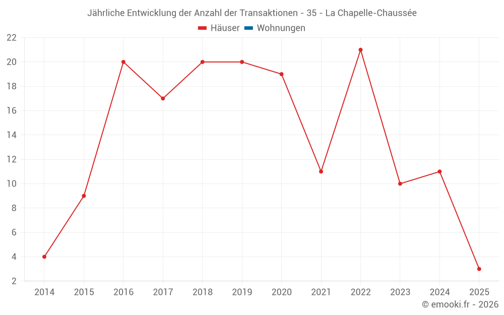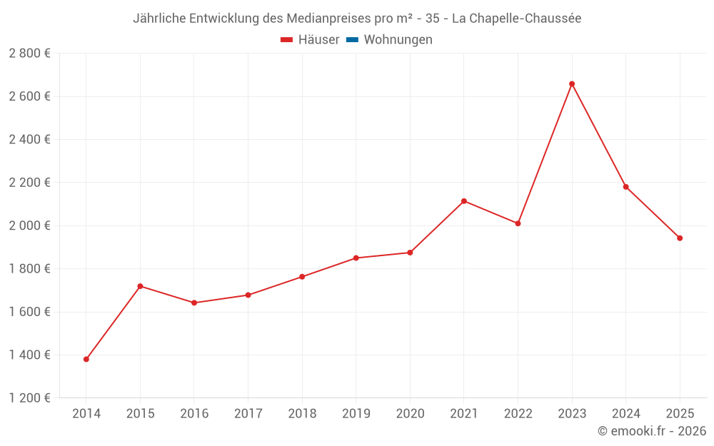 Der Durchschnittspreis auf den 17 Hausgeschäften der letzten 24 Monate in der Gemeinde La Chapelle-Chaussée betrug 2 109 € pro Quadratmeter für einen mittleren Immobilienwert von 253 950 €. Über diesen Zeitraum hinweg lagen 60% der Transaktionen zwischen 1 694 und 2 578 € pro Quadratmeter (vom 2. bis zum 8. Dezil).