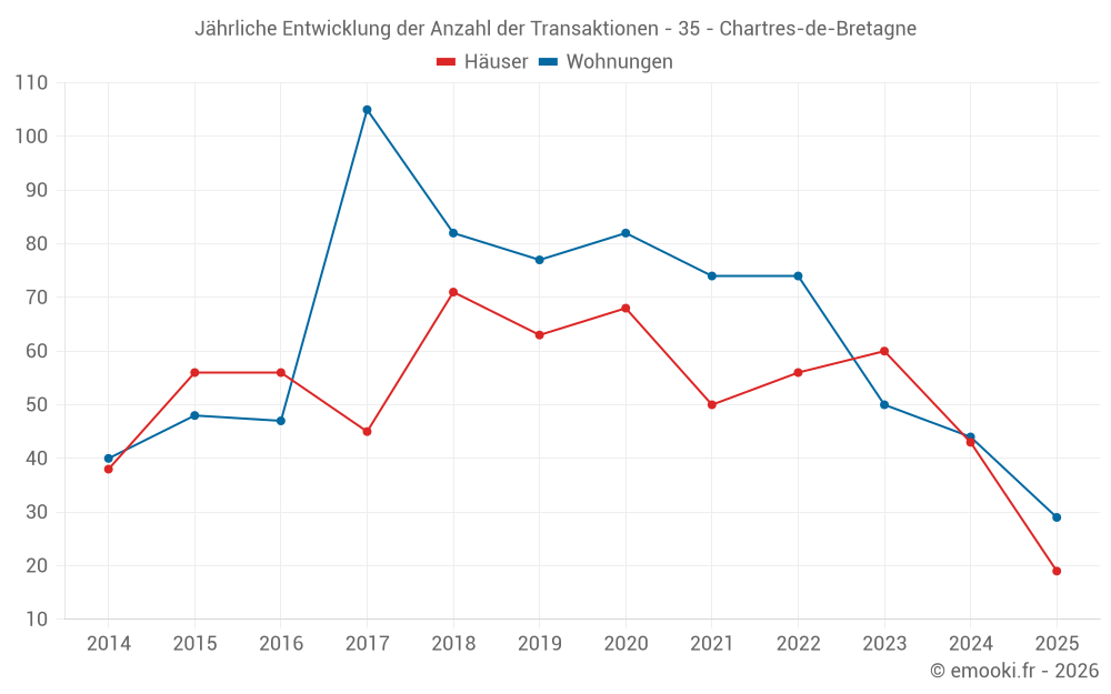 Der Durchschnittspreis auf den 29 Wohnungstransaktionen der letzten 6 Monate in der Gemeinde Chartres-de-Bretagne betrug 3 156 € pro Quadratmeter für einen mittleren Immobilienwert von 197 100 €. Über diesen Zeitraum hinweg lagen 60% der Transaktionen zwischen 2 857 und 3 446 € pro Quadratmeter (vom 2. bis zum 8. Dezil).