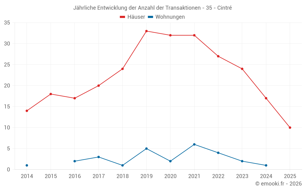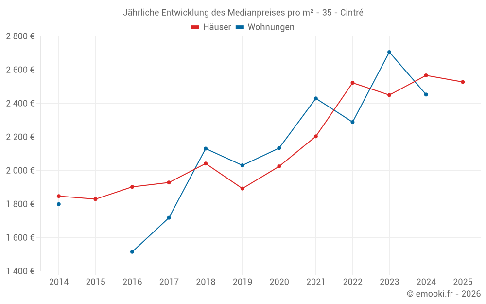 Der Durchschnittspreis auf den 18 Hausgeschäften der letzten 12 Monate in der Gemeinde Cintré betrug 2 400 € pro Quadratmeter für einen mittleren Immobilienwert von 243 400 €. Über diesen Zeitraum hinweg lagen 60% der Transaktionen zwischen 2 000 und 2 717 € pro Quadratmeter (vom 2. bis zum 8. Dezil).