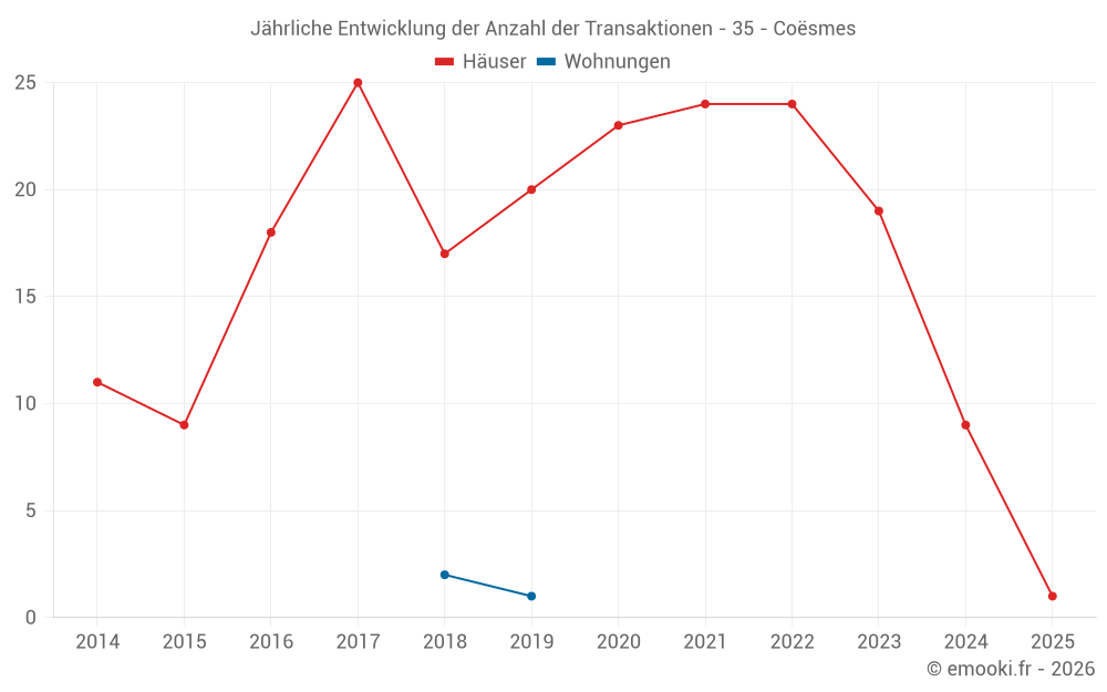 Der Durchschnittspreis auf den 22 Hausgeschäften der letzten 24 Monate in der Gemeinde Coësmes betrug 1 558 € pro Quadratmeter für einen mittleren Immobilienwert von 160 000 €. Über diesen Zeitraum hinweg lagen 60% der Transaktionen zwischen 1 156 und 1 879 € pro Quadratmeter (vom 2. bis zum 8. Dezil).