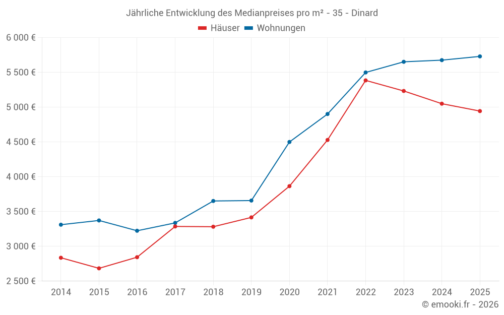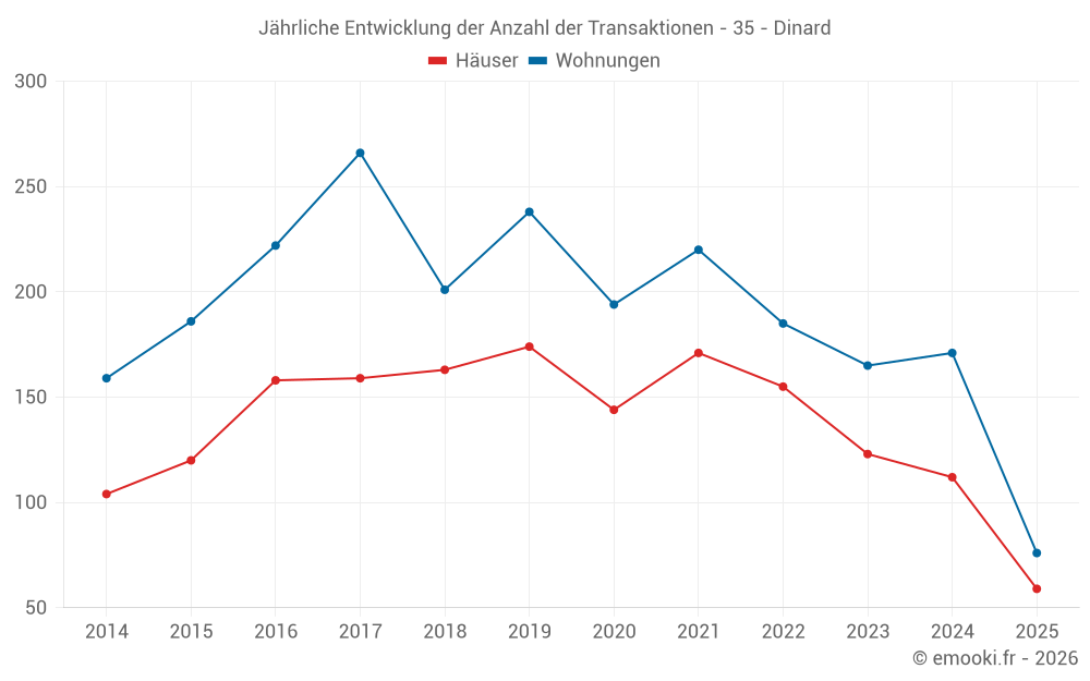 Der Durchschnittspreis auf den 30 Wohnungstransaktionen der letzten 3 Monate in der Gemeinde Dinard betrug 5 306 € pro Quadratmeter für einen mittleren Immobilienwert von 332 000 €. Über diesen Zeitraum hinweg lagen 60% der Transaktionen zwischen 4 354 und 6 466 € pro Quadratmeter (vom 2. bis zum 8. Dezil).