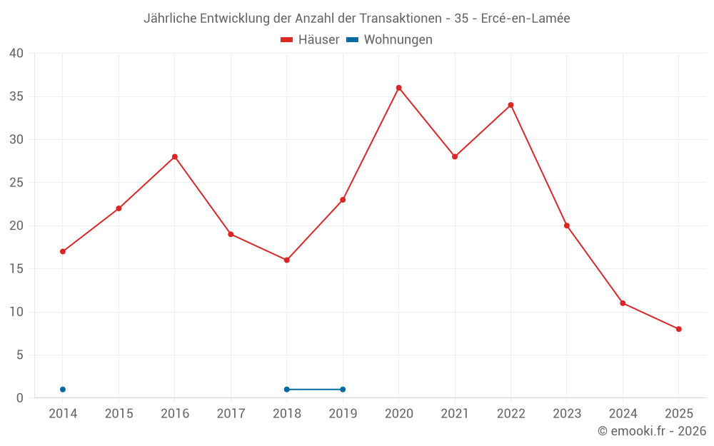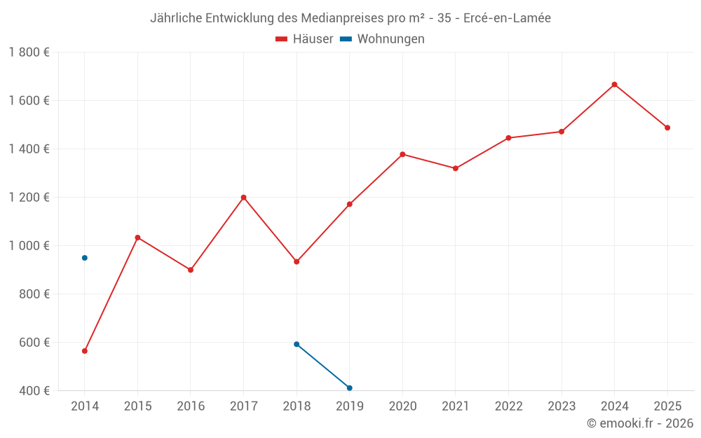 Der Durchschnittspreis auf den 27 Hausgeschäften der letzten 24 Monate in der Gemeinde Ercé-en-Lamée betrug 1 570 € pro Quadratmeter für einen mittleren Immobilienwert von 140 000 €. Über diesen Zeitraum hinweg lagen 60% der Transaktionen zwischen 781 und 2 015 € pro Quadratmeter (vom 2. bis zum 8. Dezil).