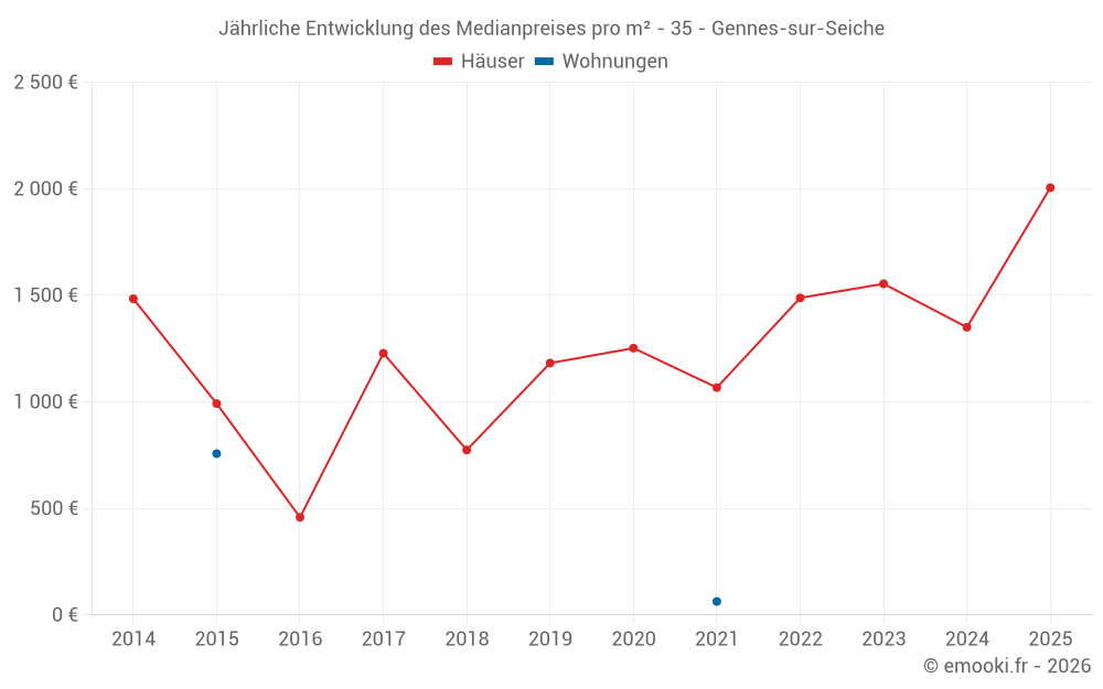 Der Durchschnittspreis auf den 16 Hausgeschäften der letzten 12 Monate in der Gemeinde Gennes-sur-Seiche betrug 2 005 € pro Quadratmeter für einen mittleren Immobilienwert von 132 500 €. Über diesen Zeitraum hinweg lagen 60% der Transaktionen zwischen 1 389 und 2 558 € pro Quadratmeter (vom 2. bis zum 8. Dezil).