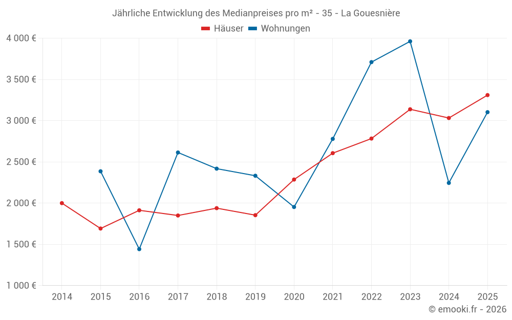 Der Durchschnittspreis auf den 16 Hausgeschäften der letzten 12 Monate in der Gemeinde La Gouesnière betrug 2 991 € pro Quadratmeter für einen mittleren Immobilienwert von 282 500 €. Über diesen Zeitraum hinweg lagen 60% der Transaktionen zwischen 2 533 und 3 244 € pro Quadratmeter (vom 2. bis zum 8. Dezil).