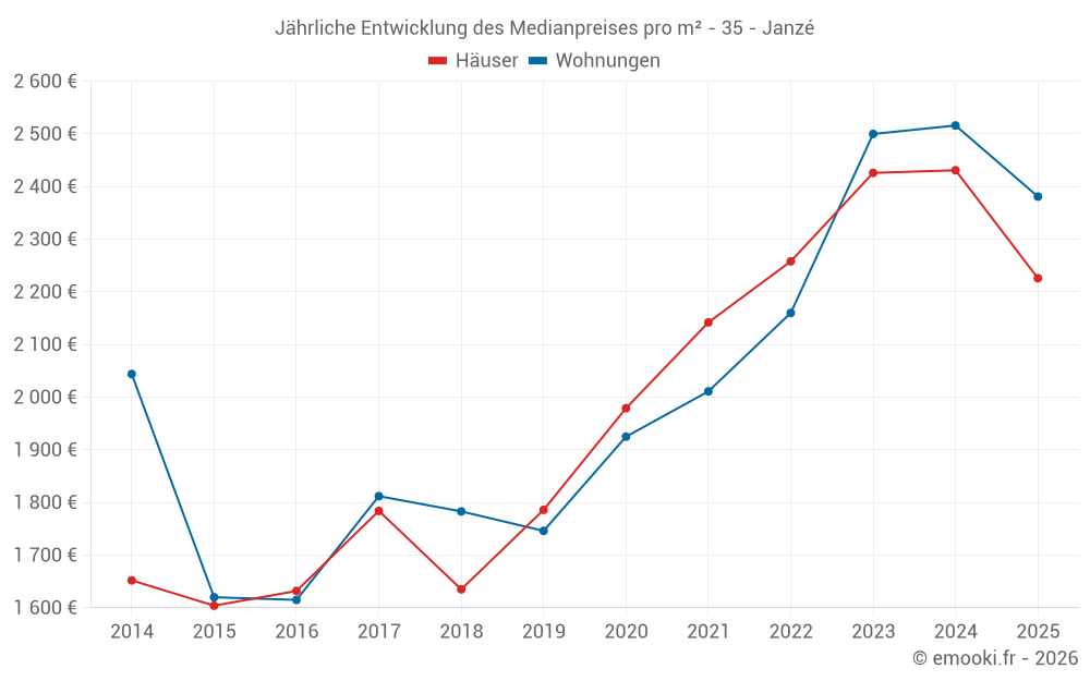 Der Durchschnittspreis auf den 36 Wohnungstransaktionen der letzten 12 Monate in der Gemeinde Janzé betrug 2 513 € pro Quadratmeter für einen mittleren Immobilienwert von 147 500 €. Über diesen Zeitraum hinweg lagen 60% der Transaktionen zwischen 2 110 und 2 694 € pro Quadratmeter (vom 2. bis zum 8. Dezil).