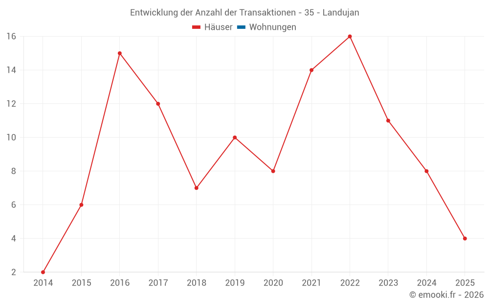 Der Durchschnittspreis auf den 19 Hausgeschäften der letzten 24 Monate in der Gemeinde Landujan betrug 1 763 € pro Quadratmeter für einen mittleren Immobilienwert von 160 000 €. Über diesen Zeitraum hinweg lagen 60% der Transaktionen zwischen 1 214 und 2 428 € pro Quadratmeter (vom 2. bis zum 8. Dezil).