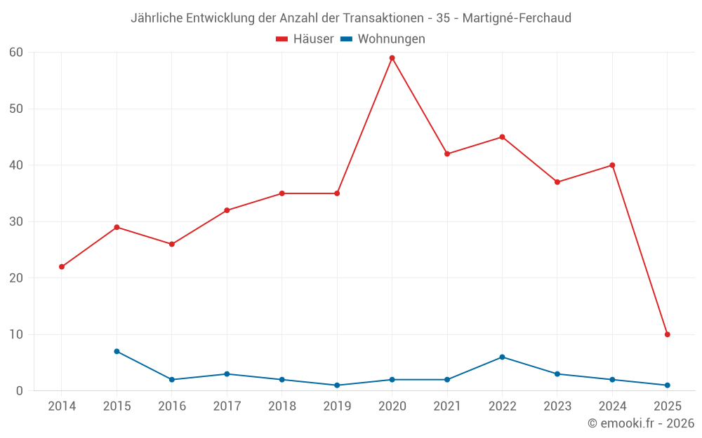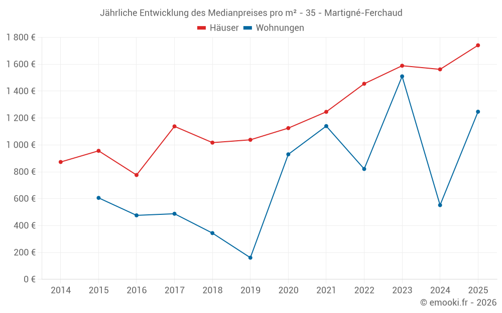 Der Durchschnittspreis auf den 36 Hausgeschäften der letzten 12 Monate in der Gemeinde Martigné-Ferchaud betrug 1 660 € pro Quadratmeter für einen mittleren Immobilienwert von 139 500 €. Über diesen Zeitraum hinweg lagen 60% der Transaktionen zwischen 1 250 und 2 019 € pro Quadratmeter (vom 2. bis zum 8. Dezil).