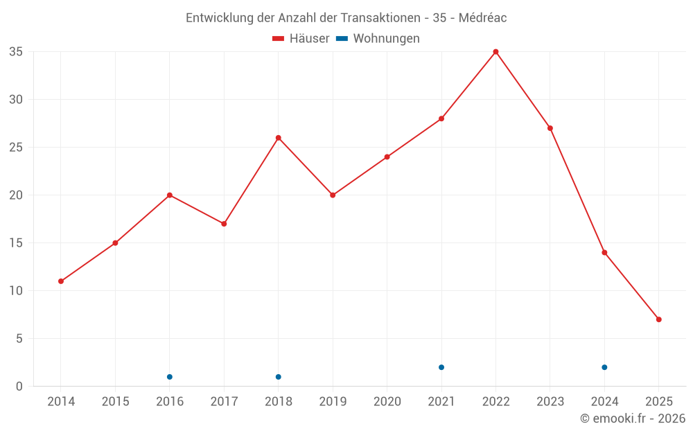 Der Durchschnittspreis auf den 36 Hausgeschäften der letzten 24 Monate in der Gemeinde Médréac betrug 1 662 € pro Quadratmeter für einen mittleren Immobilienwert von 173 000 €. Über diesen Zeitraum hinweg lagen 60% der Transaktionen zwischen 1 318 und 2 143 € pro Quadratmeter (vom 2. bis zum 8. Dezil).
