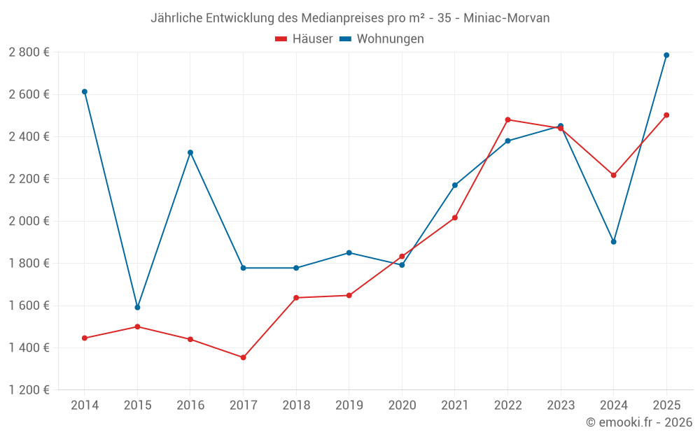 Der Durchschnittspreis auf den 21 Hausgeschäften der letzten 6 Monate in der Gemeinde Miniac-Morvan betrug 2 502 € pro Quadratmeter für einen mittleren Immobilienwert von 245 000 €. Über diesen Zeitraum hinweg lagen 60% der Transaktionen zwischen 1 795 und 2 980 € pro Quadratmeter (vom 2. bis zum 8. Dezil).