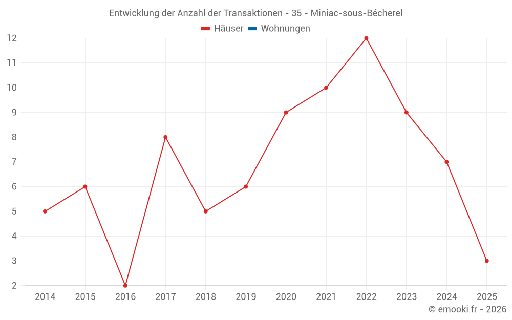 Der Durchschnittspreis auf den 15 Hausgeschäften der letzten 24 Monate in der Gemeinde Miniac-sous-Bécherel betrug 1 513 € pro Quadratmeter für einen mittleren Immobilienwert von 118 000 €. Über diesen Zeitraum hinweg lagen 60% der Transaktionen zwischen 1 062 und 2 053 € pro Quadratmeter (vom 2. bis zum 8. Dezil).