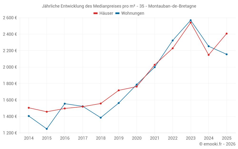 Der Durchschnittspreis auf den 24 Wohnungstransaktionen der letzten 24 Monate in der Gemeinde Montauban-de-Bretagne betrug 2 230 € pro Quadratmeter für einen mittleren Immobilienwert von 152 500 €. Über diesen Zeitraum hinweg lagen 60% der Transaktionen zwischen 1 860 und 2 649 € pro Quadratmeter (vom 2. bis zum 8. Dezil).