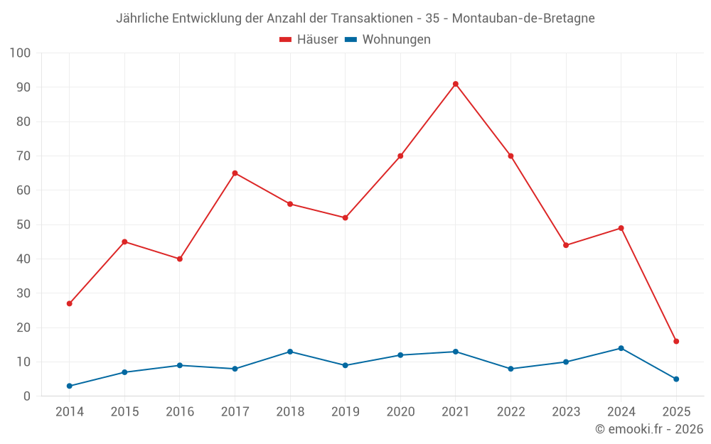 Der Durchschnittspreis auf den 43 Hausgeschäften der letzten 12 Monate in der Gemeinde Montauban-de-Bretagne betrug 2 292 € pro Quadratmeter für einen mittleren Immobilienwert von 220 000 €. Über diesen Zeitraum hinweg lagen 60% der Transaktionen zwischen 1 865 und 2 804 € pro Quadratmeter (vom 2. bis zum 8. Dezil).