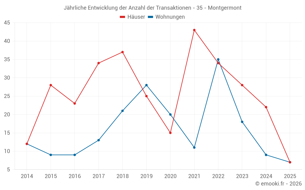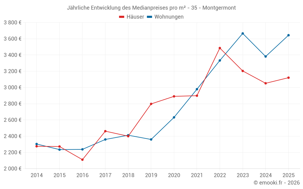Der Durchschnittspreis auf den 19 Hausgeschäften der letzten 12 Monate in der Gemeinde Montgermont betrug 3 017 € pro Quadratmeter für einen mittleren Immobilienwert von 347 000 €. Über diesen Zeitraum hinweg lagen 60% der Transaktionen zwischen 2 612 und 3 463 € pro Quadratmeter (vom 2. bis zum 8. Dezil).