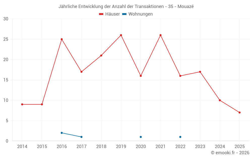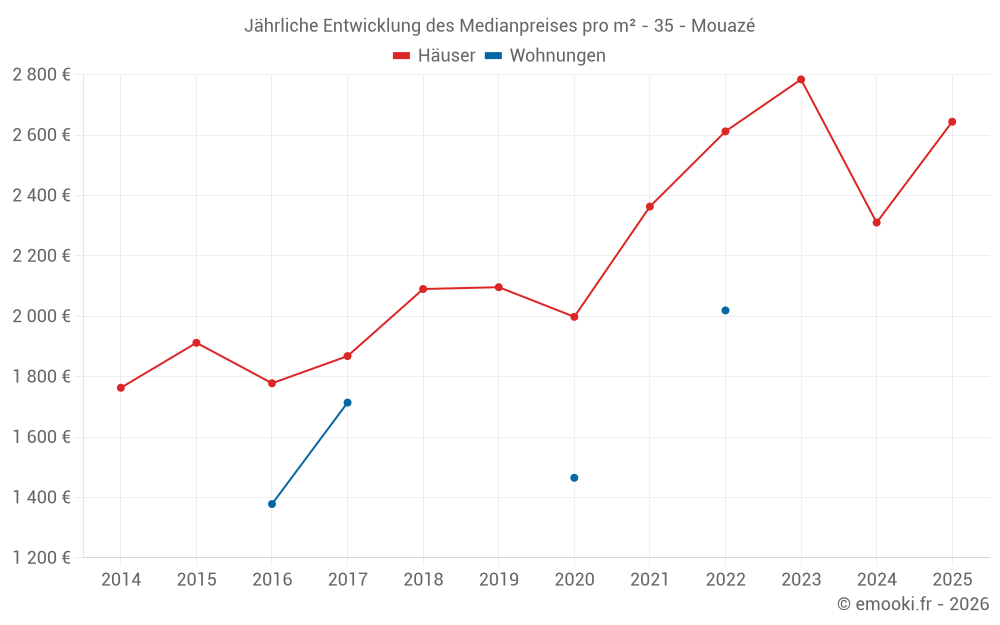 Der Durchschnittspreis auf den 27 Hausgeschäften der letzten 24 Monate in der Gemeinde Mouazé betrug 2 579 € pro Quadratmeter für einen mittleren Immobilienwert von 250 000 €. Über diesen Zeitraum hinweg lagen 60% der Transaktionen zwischen 2 139 und 2 919 € pro Quadratmeter (vom 2. bis zum 8. Dezil).