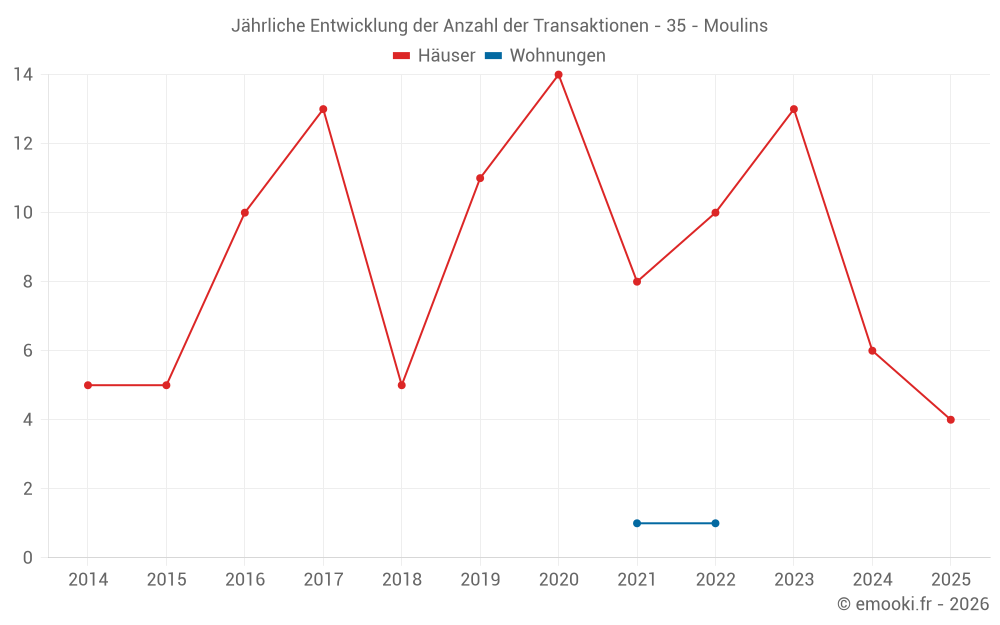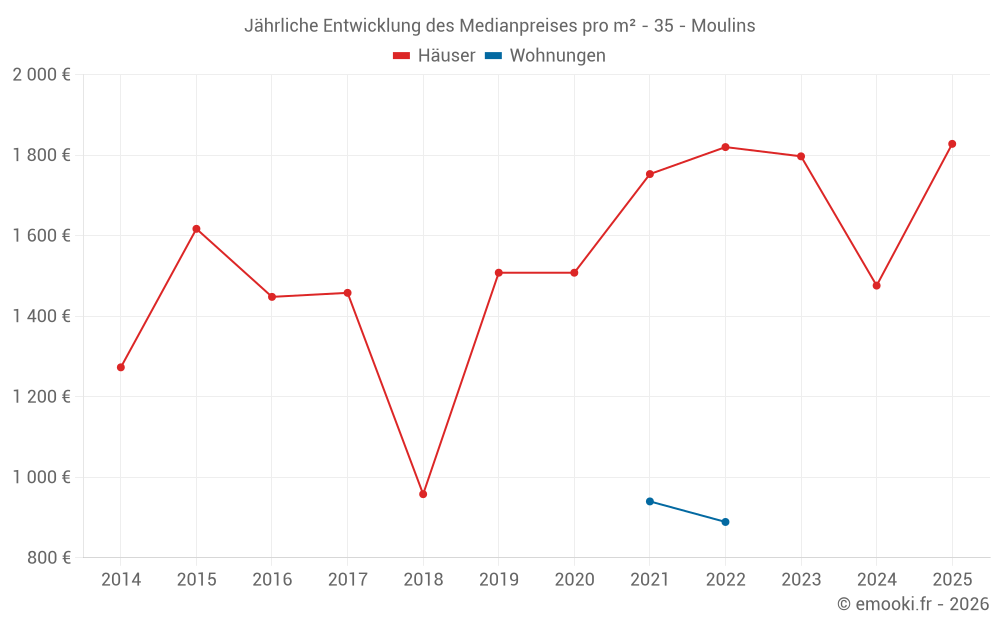 Der Durchschnittspreis auf den 14 Hausgeschäften der letzten 24 Monate in der Gemeinde Moulins betrug 2 007 € pro Quadratmeter für einen mittleren Immobilienwert von 227 500 €. Über diesen Zeitraum hinweg lagen 60% der Transaktionen zwischen 918 und 2 147 € pro Quadratmeter (vom 2. bis zum 8. Dezil).